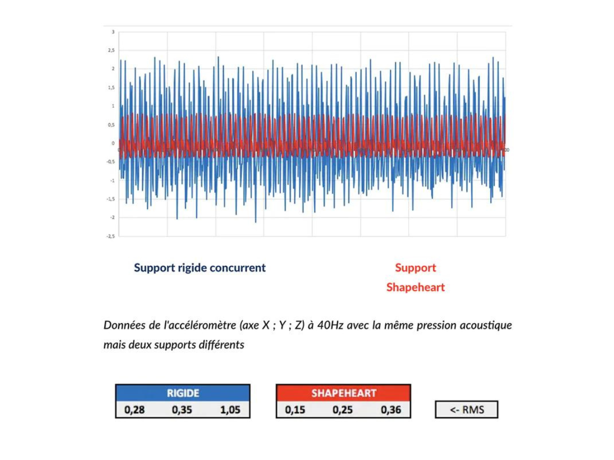 Conclusión: en todos los ejes, el soporte Shapeheart absorbe las vibraciones del motor en un 47% en promedio en comparación con un soporte rígido.