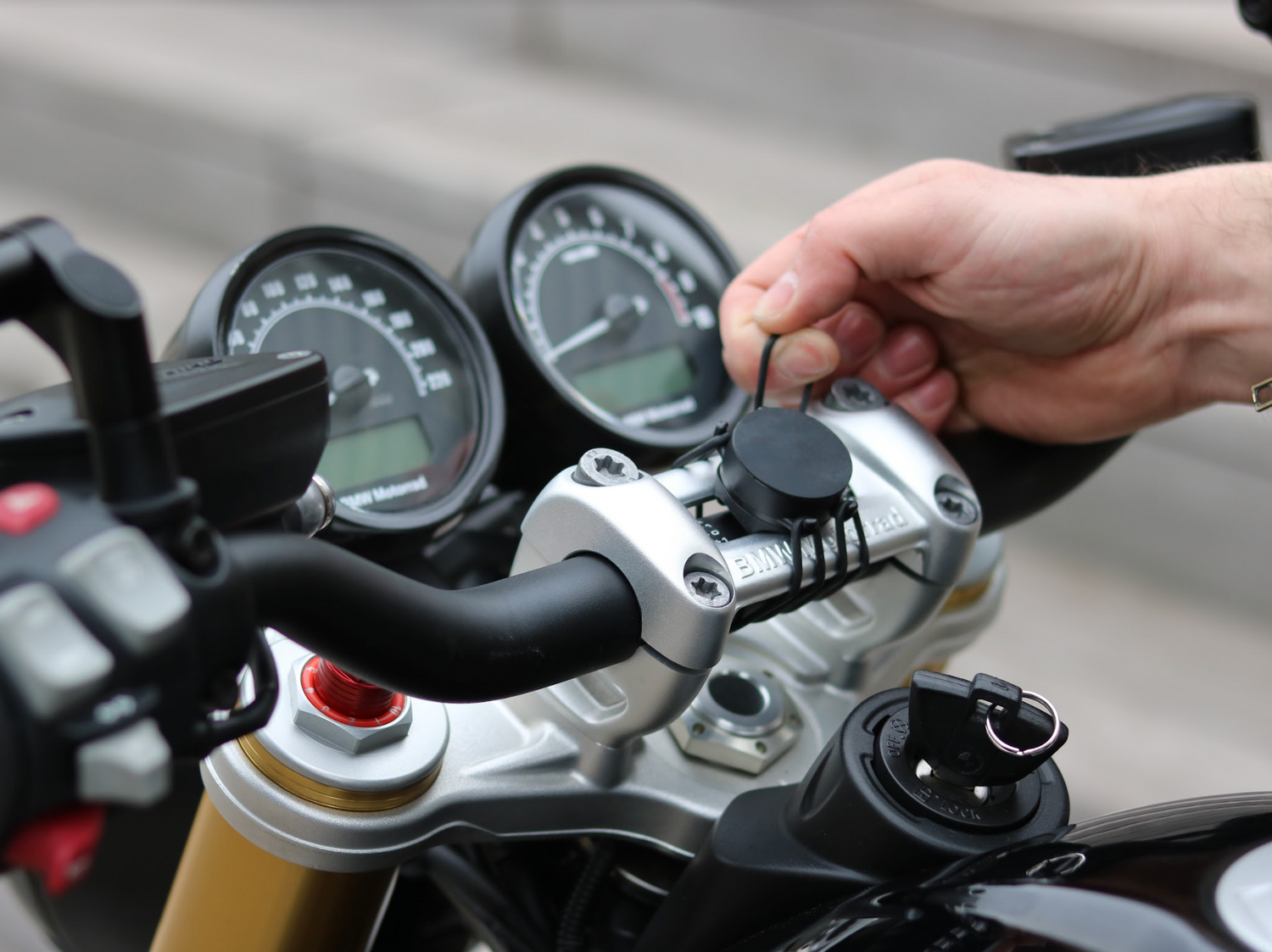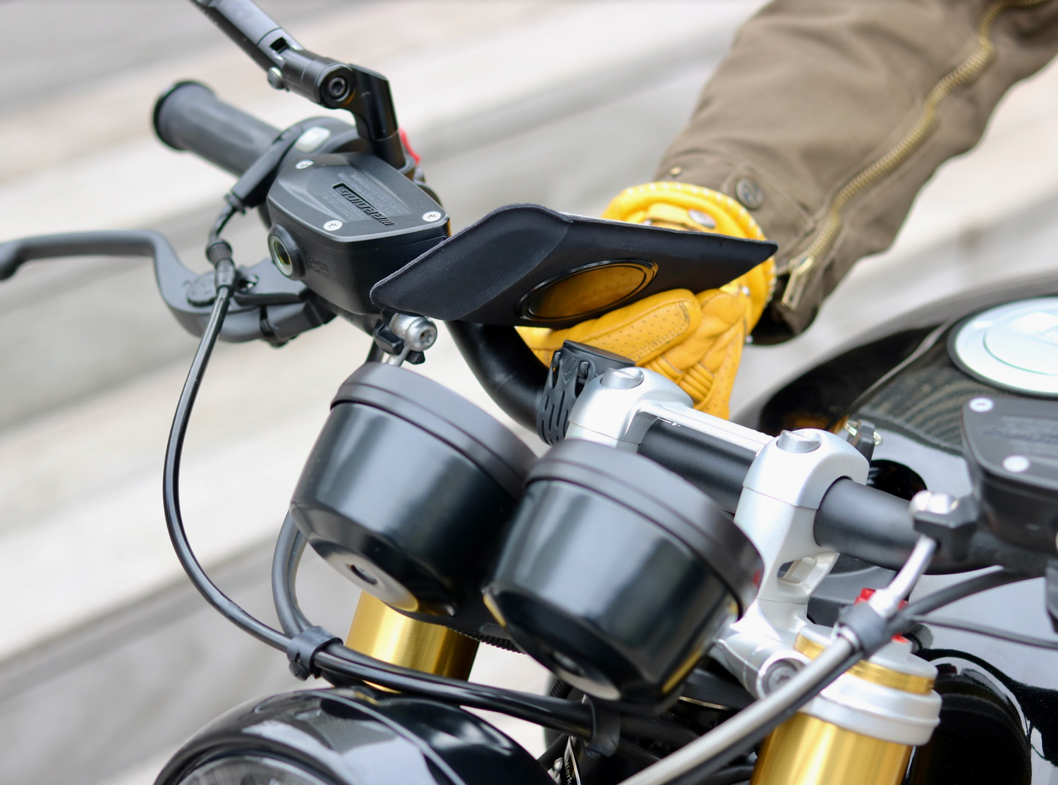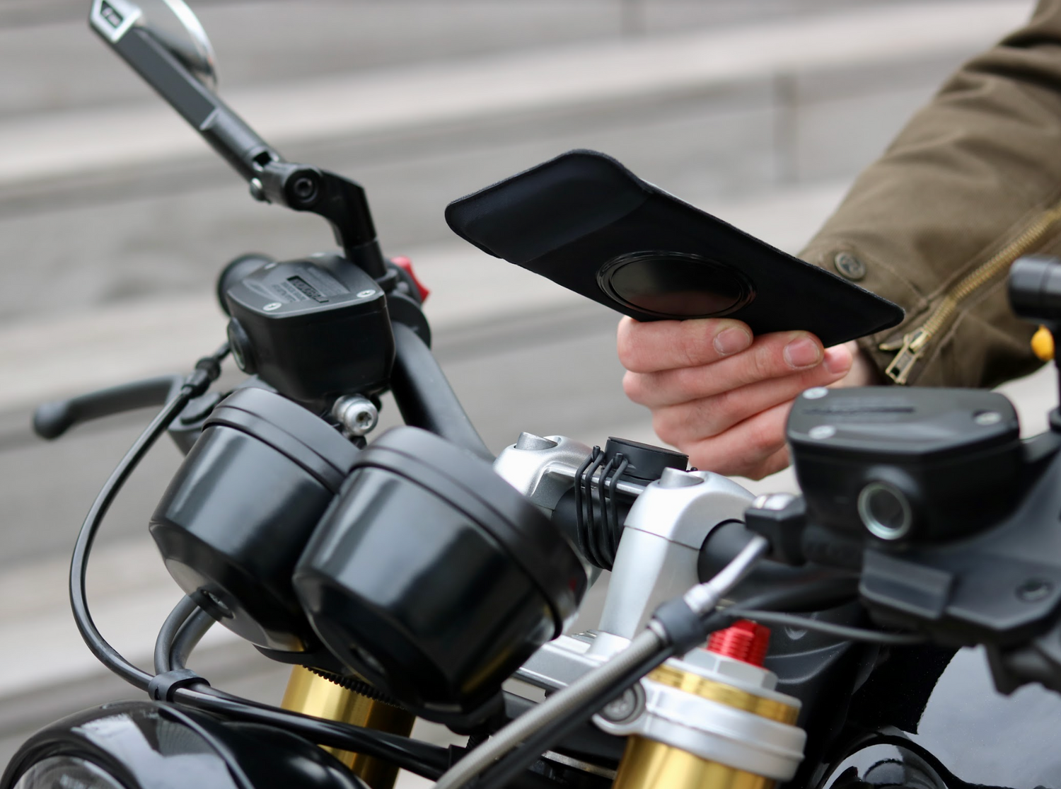 Solo se necesitan unos segundos para instalar el soporte para Motocicleta Clásica. Este accesorio se adapta perfectamente a manillares de 20 a 50 mm de diámetro gracias a sus bandas elásticas o correa (ambos sistemas de montaje están incluidos). Simplemente desliza tu teléfono en la funda y fíjalo magnéticamente al soporte.
