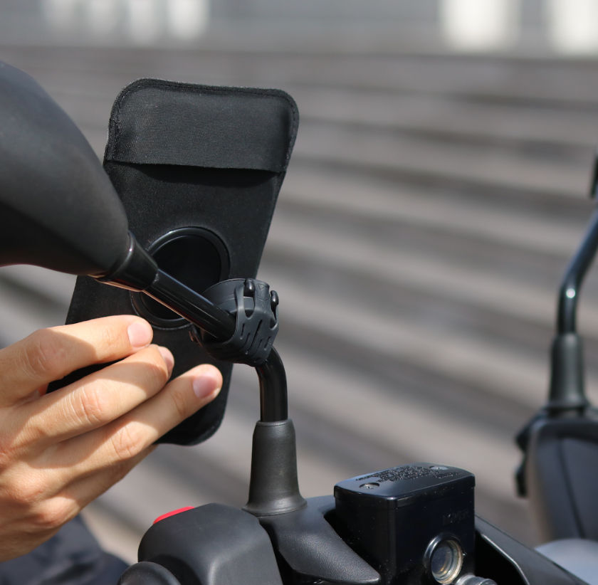 - Coloca el soporte en el tubo del retrovisor de tu scooter y luego fija la correa.