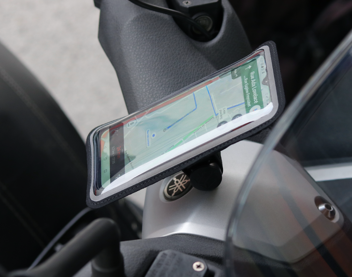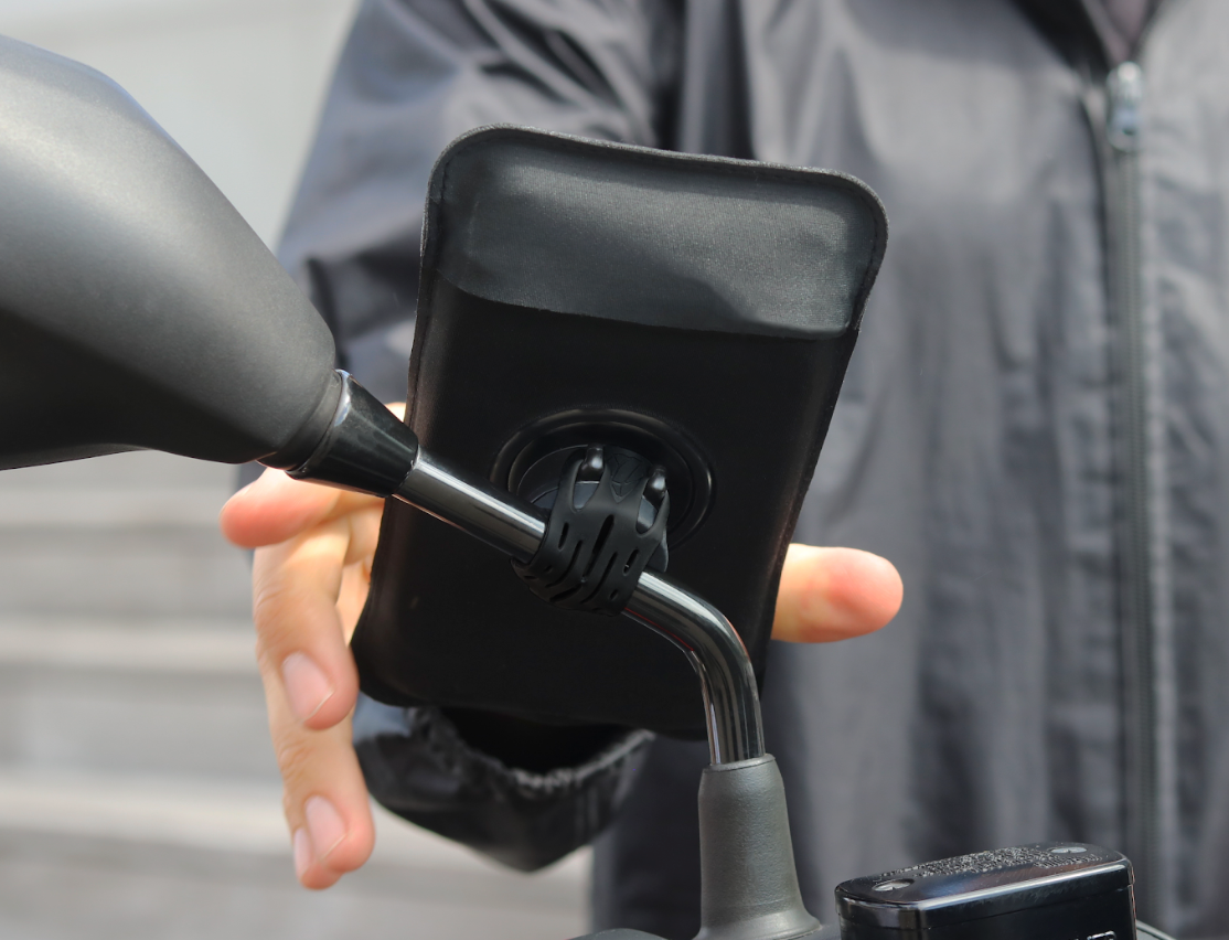La correa está hecha de silicona ultrarresistente con 2 años de garantía. No hay riesgo de dañar la pintura de tu scooter. - Mete el teléfono en la funda, encájalo en el soporte (asegurándote de que esté centrado) y ¡listo!