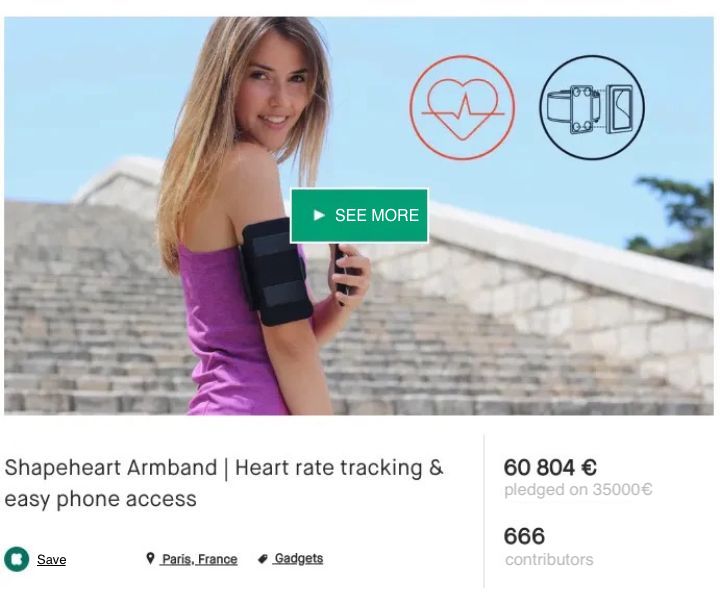 Shapeheart es la historia de dos emprendedores que ya no soportaban hacer ejercicio con brazaletes incómodos y mal diseñados. Gracias a una campaña de micromecenazgo en Kickstarter, pudieron financiar su proyecto de brazalete con funda magnética extraíble y sensor de frecuencia cardíaca integrado, y probar su idea directamente con los consumidores.